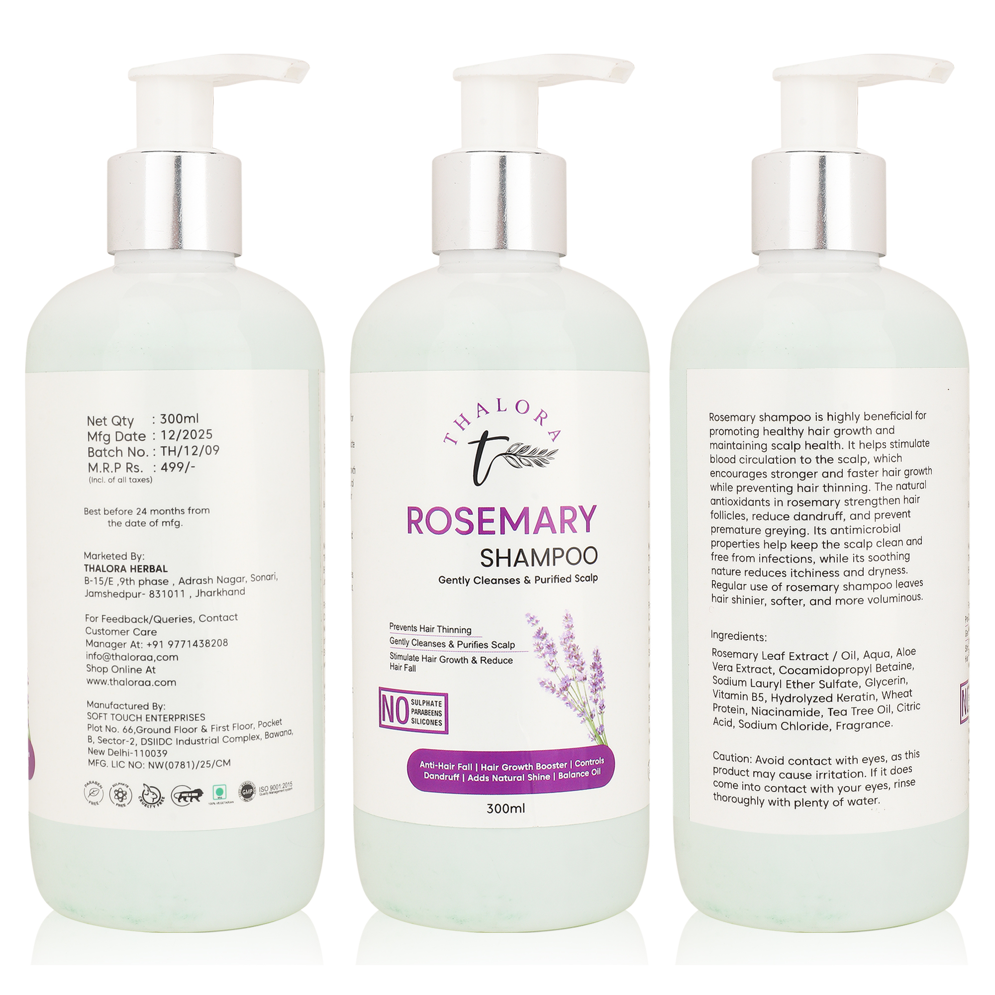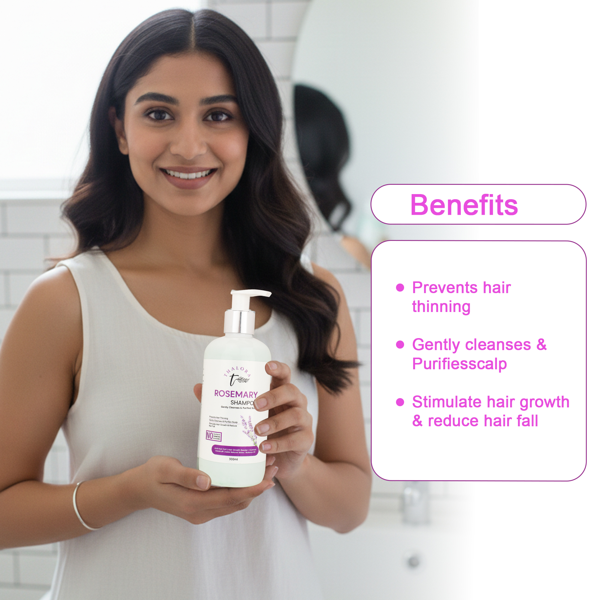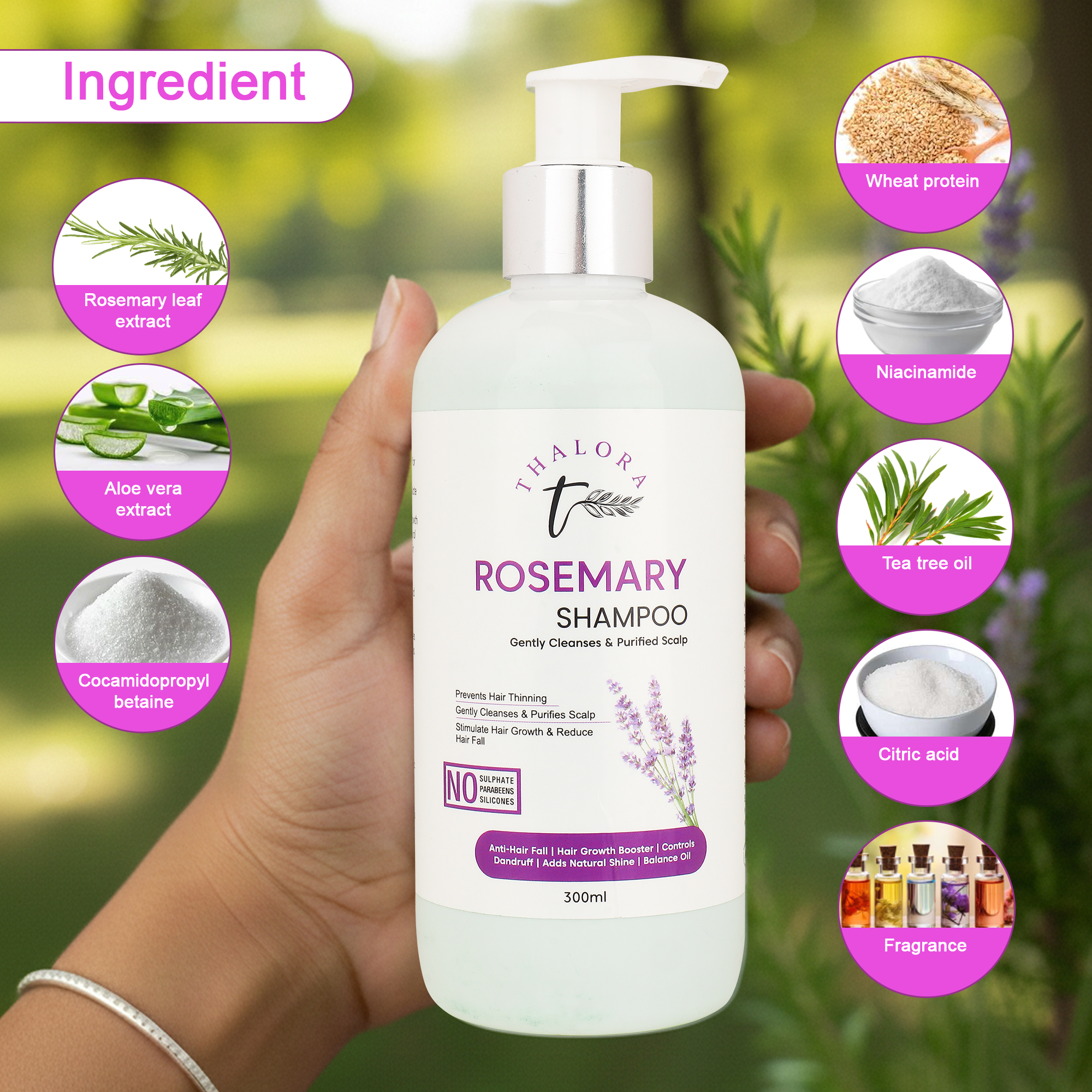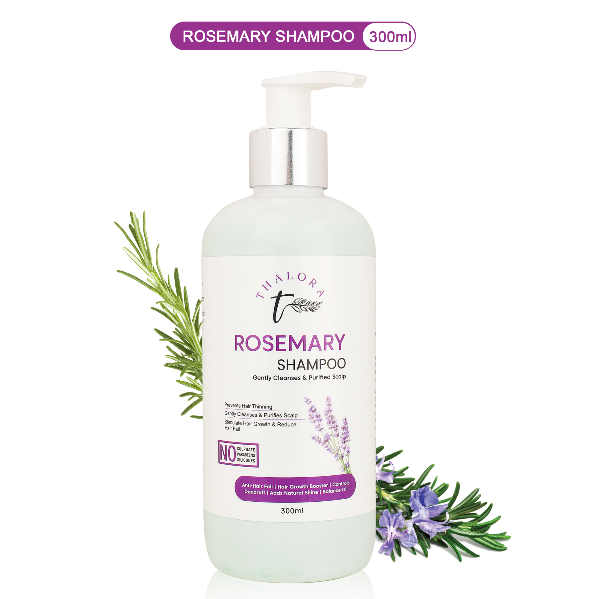 Thalora Rosemary Shampoo is a gentle cleansing formula designed to purify the scalp, reduce hair thinning, and support healthy hair growth. Infused with Rosemary Leaf Extract/Oil, this shampoo helps stimulate blood circulation to the scalp, encouraging stronger and healthier-looking hair.